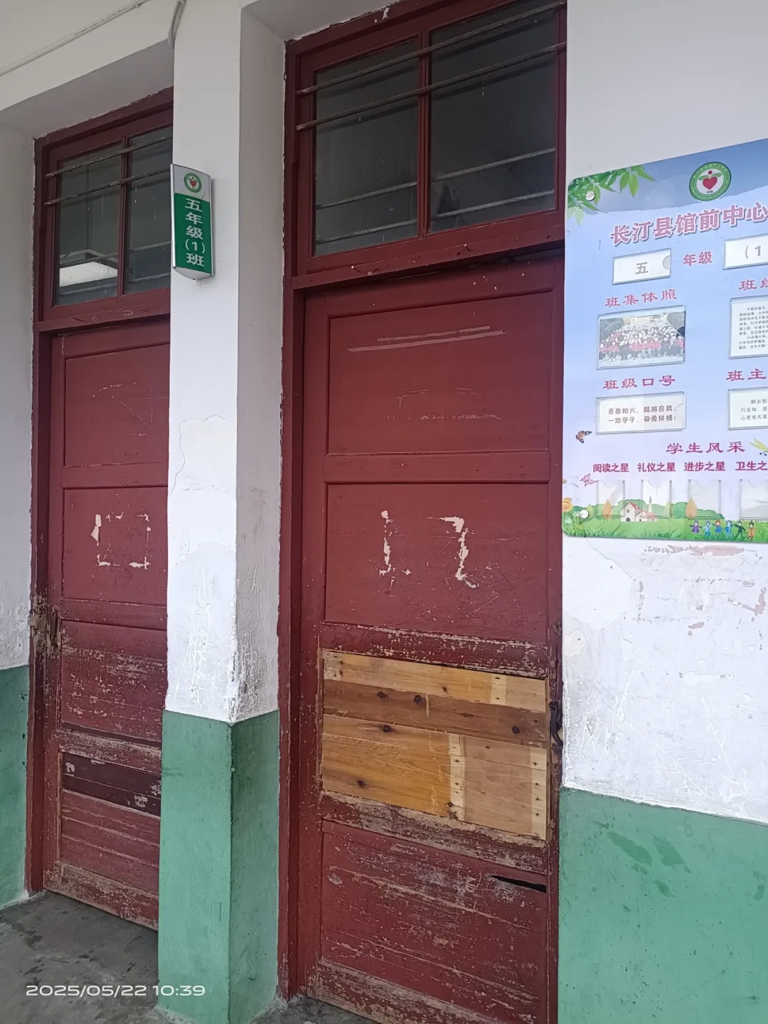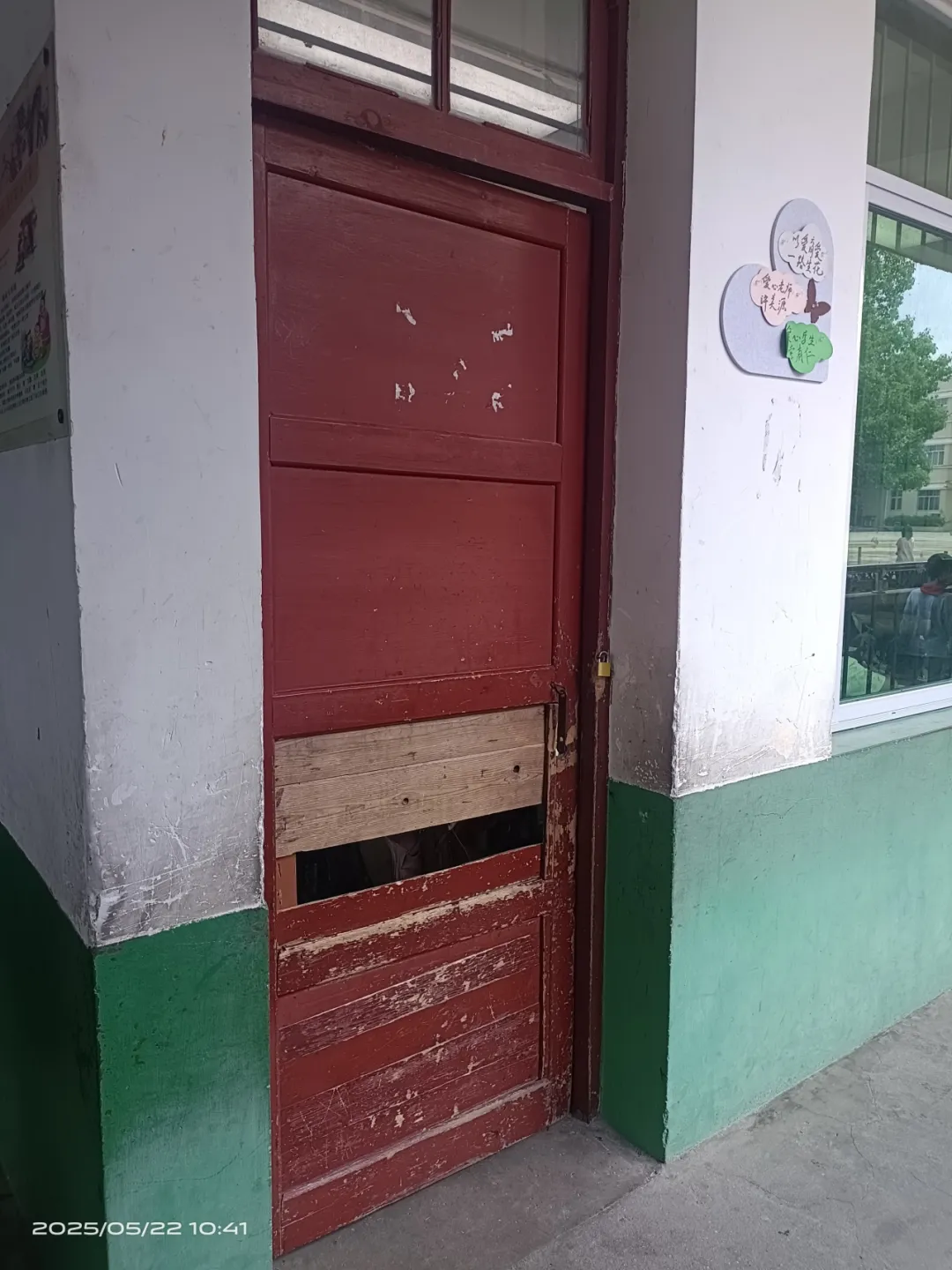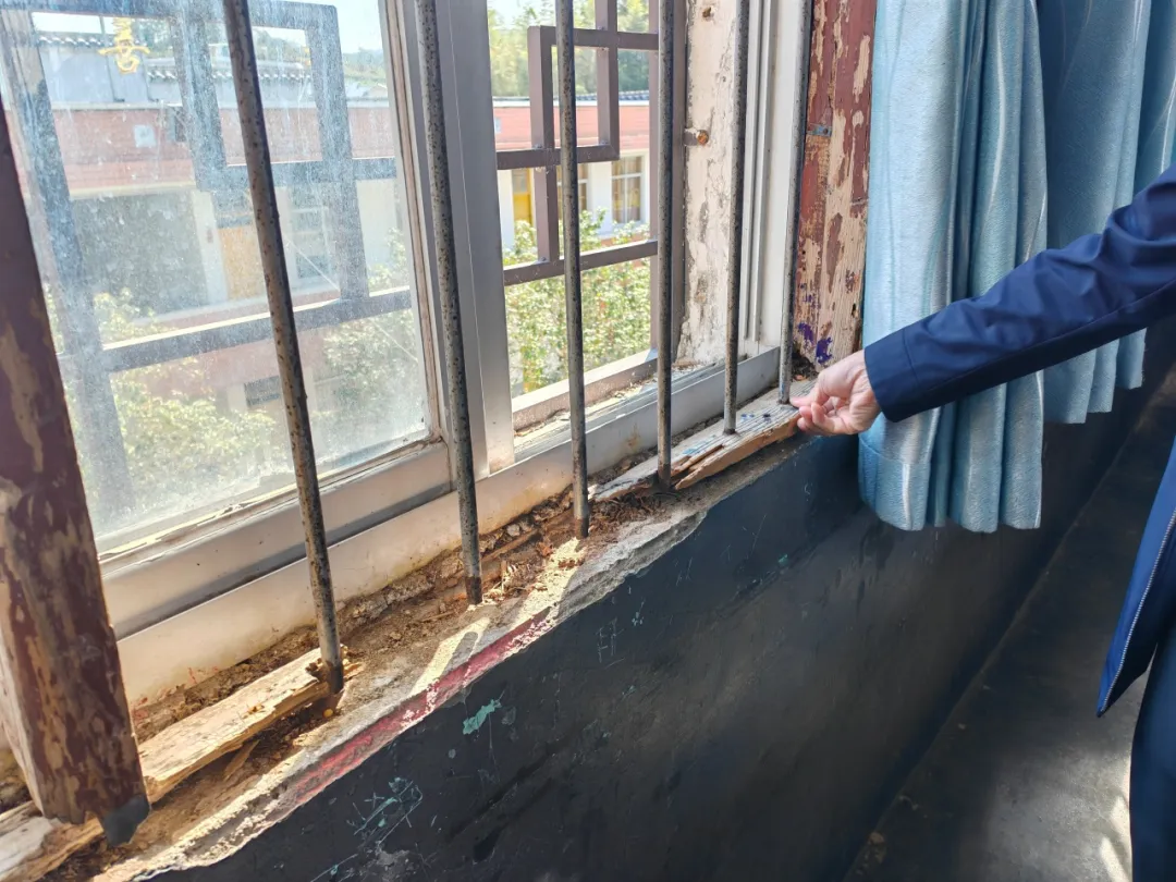 因建成年代较久,校舍屋面渗漏,又加虫蛀,门窗大面积腐蚀变形,既影响美观,也带来安全隐患。部分教室门破损严重,外层铁皮开裂,难以继续使用。